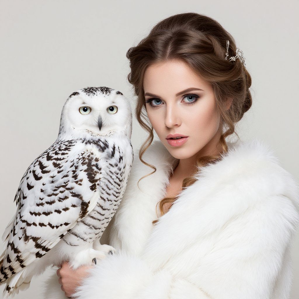 In this captivating image, a beautiful Russian girl model exudes elegance and grace, adorned in a luxurious white fur coat that contrasts beautifully with the light studio background. Her hair, styled in an intricate updo, is accented with a delicate headpiece that complements her sophisticated look. The model's symmetrical eyes, highlighted by meticulous makeup, gaze directly into the camera, creating a sense of connection with the viewer. To her left, a majestic snow owl perches gracefully, its piercing blue eyes and intricate feather patterns adding a touch of wild beauty to the scene. The owl's presence, combined with the model's refined attire and the soft, diffused lighting, evokes a sense of timeless elegance and natural harmony. The overall composition, with its harmonious balance of elements and meticulous attention to detail, reflects a fine-art photoshoot style reminiscent of Annie Leibovitz's work, capturing both the model's and the owl's distinct characteristics in a visually striking manner.