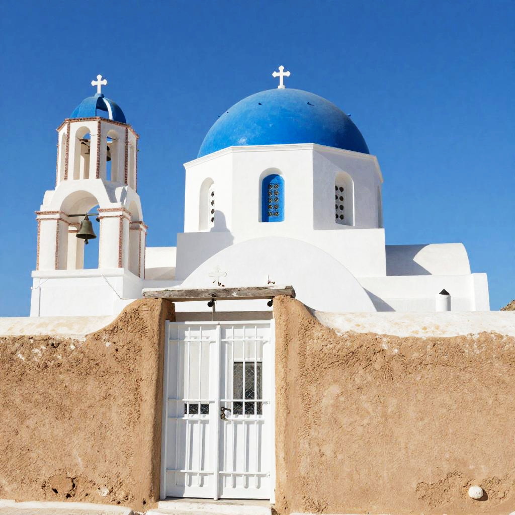 This image is a digital rendering of a sunny, blue-sky scene featuring a traditional whitewashed windmill with a brown roof and a large, multi-blade wind sail. Behind the windmill, there's a smaller dome-shaped building with a yellowish-brown roof. In the foreground, there's a bright blue archway. The buildings have a textured, stucco-like appearance, and the overall style evokes a Mediterranean or Greek island vibe.
