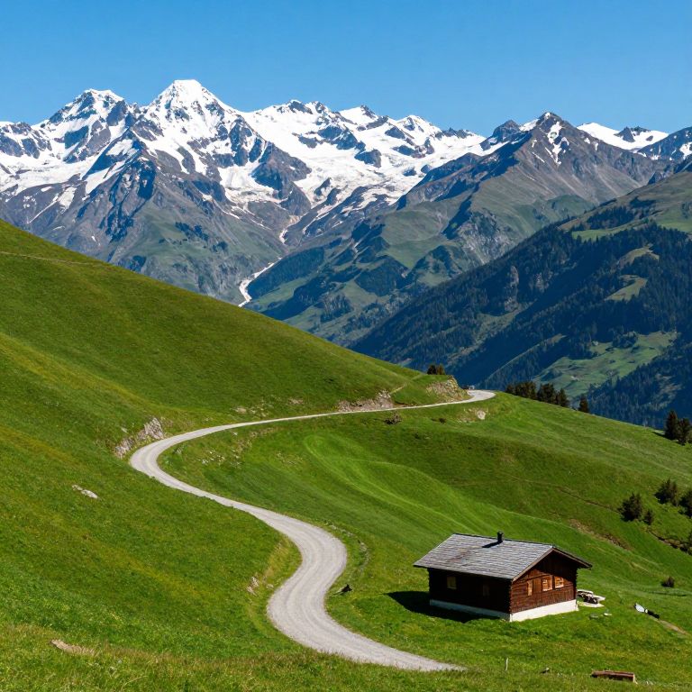 Photograph of a vibrant alpine landscape featuring a winding gravel road curving through lush green hills. In the foreground, a small, dark wooden cabin with a gray shingled roof sits to the right. The background showcases towering, snow-capped mountains under a clear, bright blue sky. The mountains have patches of dark green forests, adding contrast to the white snow and green grass. The image captures the serene and picturesque quality of a mountainous region during a sunny day.