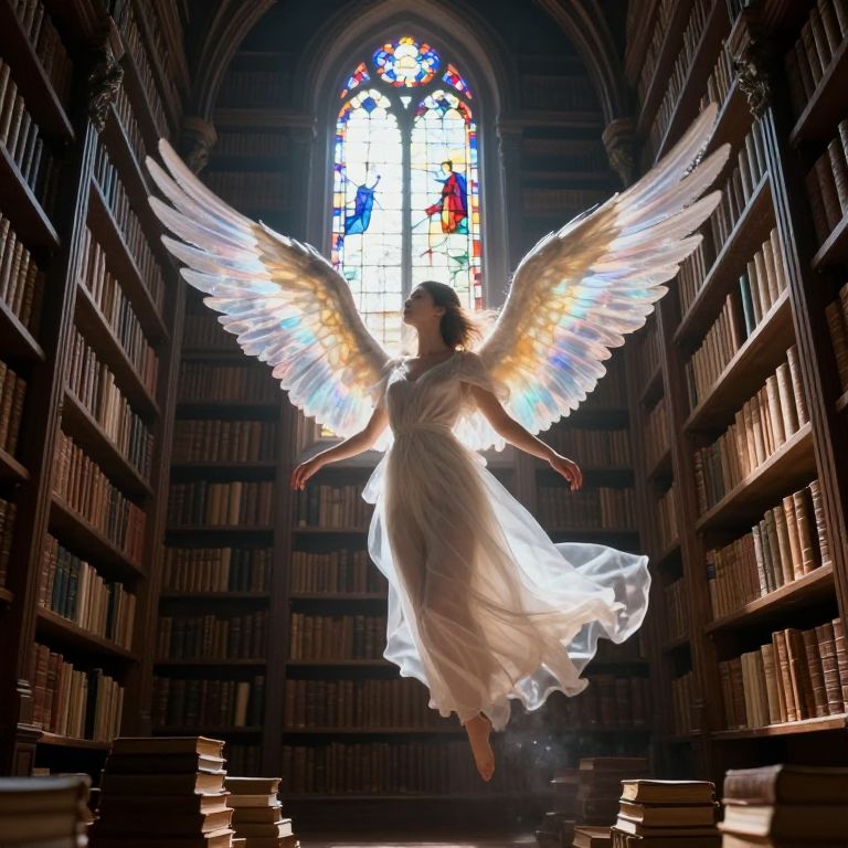 A ethereal figure with radiant, translucent wings gracefully floats through a grand library, where sunlight filters through stained glass windows, casting a divine glow over endless rows of ancient books.