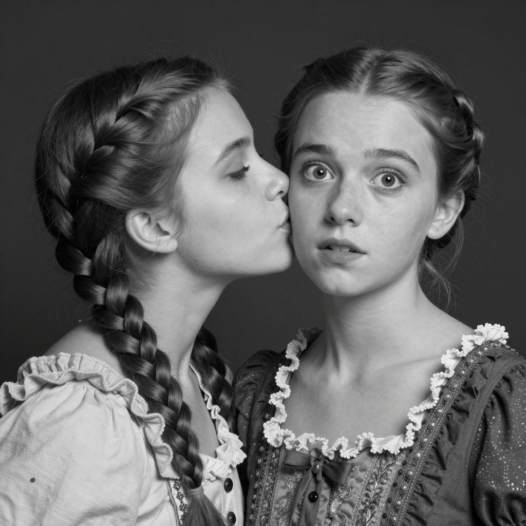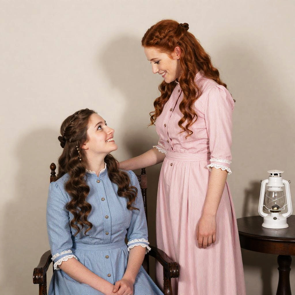 Photograph of two women in Victorian-style dresses. Standing woman in pink striped dress with long red hair, leaning forward, smiling. Seated woman in blue dress with brown hair, smiling back, looking up. Shadow of standing woman on wall. Ornate dark wood chair in background. White kerosene lamp on table to right.