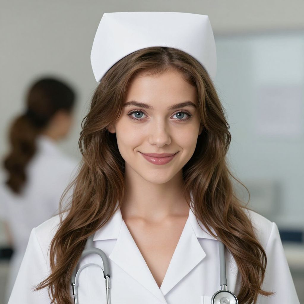 "who doctor costume, stethoscope, 1girl, solo, nurse, brown hair, hat, long hair, nurse cap, smile, blue eyes, looking at viewer, blurry, curly hair, blurry background, doctor, realistic Realistic photo of casual sexy person with pretty face"