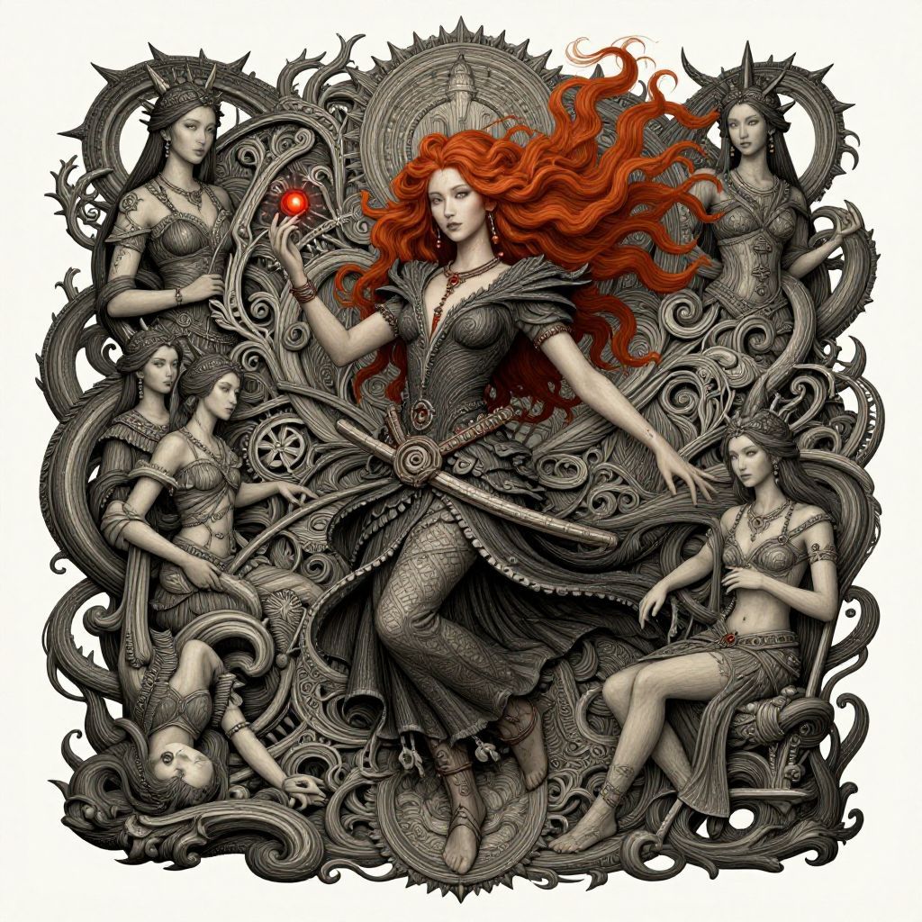 This digital drawing features a central, fair-skinned, red-haired woman with voluminous, fiery hair, wearing a black, ornate dress with intricate patterns. She holds a red apple in her right hand, her left hand extended. Surrounding her are four identical, grey-scale, ethereal women with serpentine hair and matching black, patterned attire, each holding different objects. The background is an elaborate, black, and grey, swirling, spiked design, creating a gothic, fantasy feel. The central woman's dress has a mermaid-like texture, and she is adorned with a necklace. The image has a high-contrast, monochromatic palette, emphasizing the central red-haired figure.