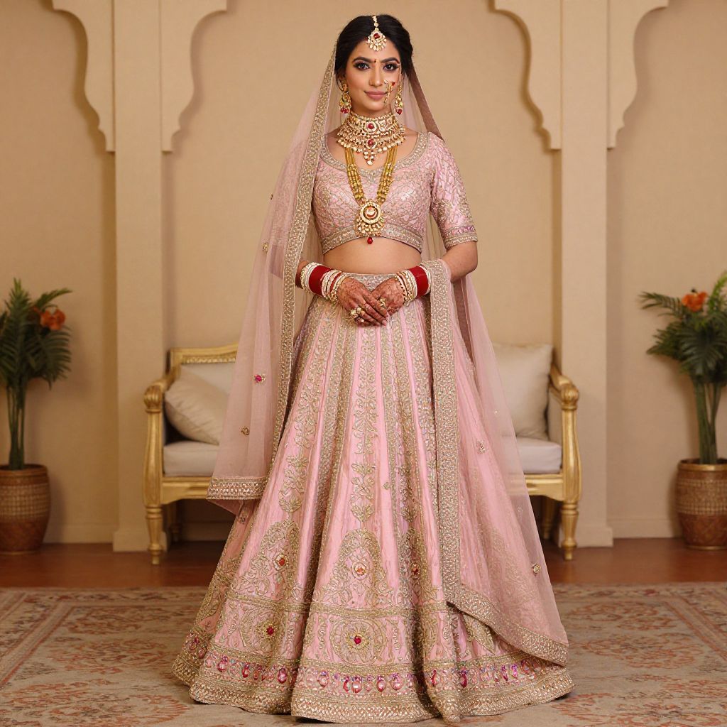 "Wedding Lehenga Bride Costume, a woman in a pink outfit and gold jewelry poses for a photo"