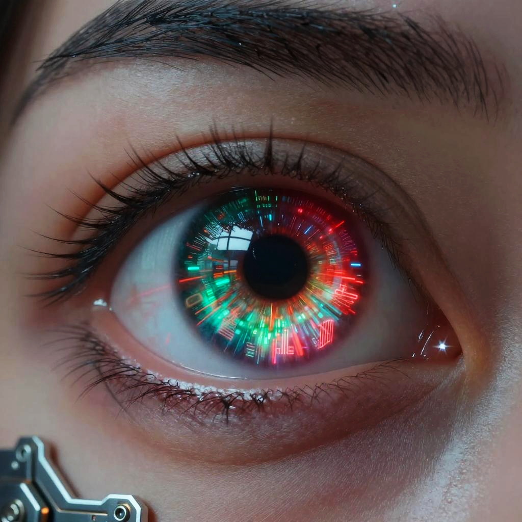 Eye color changer concept illustrated with a cyberpunk aesthetic, neon eye filters scanning and altering color from emerald green to ruby red, cityscape reflections in the eye, intricate mechanical details with tech circuit patterns glowing around the eyeball.