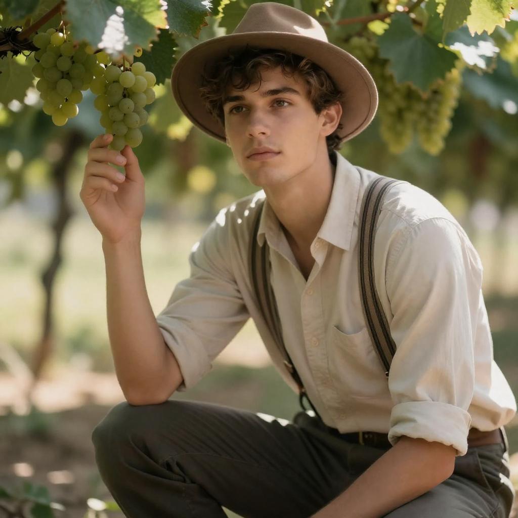 Sunset terraced vineyard during harvest golden hour, rows of grapevines heavy with clusters, lanterns strung between posts, warm backlight, soft haze, scattered crushed grape skins and drifting leaves, teenage boy with dark curly hair in a worn denim jacket over a flannel shirt, ink- and grape-stained hands, carrying a wicker harvest basket, rolled-up sleeves and a bright open grin, young miniature donkey foal with soft grey coat and tufted mane nuzzling his hip, tiny muddy hoof prints and a simple woven halter, candid affection, natural light, soft focus background with creamy bokeh, gentle rim light, subtle haze, cozy intimate mood, wind in hair, natural skin texture, environmental details (paw prints, drifting petals, light drizzle), slight grain, storytelling composition, color grade with warm highlights and cool shadows, high detail, subtle vignette
