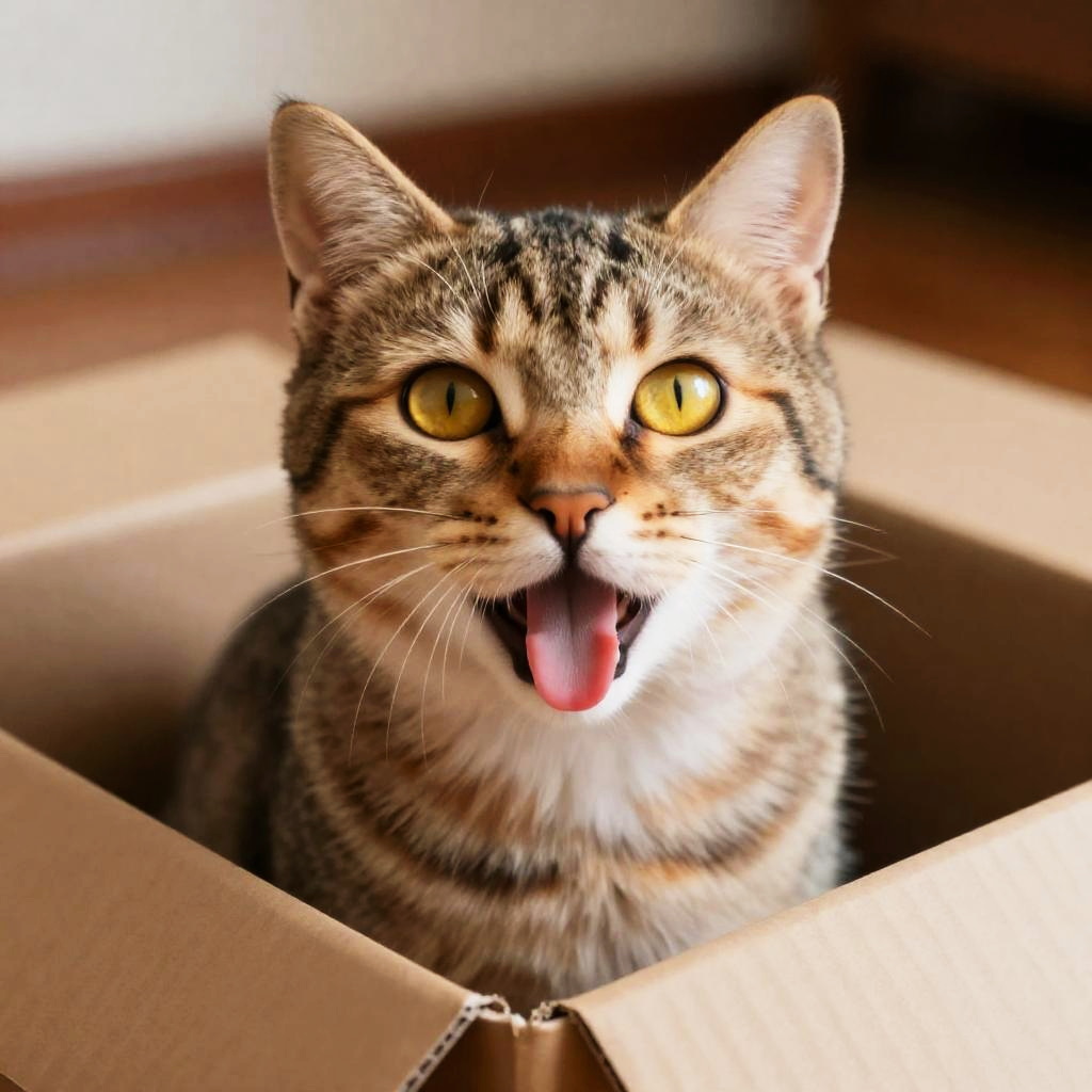 (photorealistic:1.4), official art, unity 8k wallpaper, ultra detailed, beautiful and aesthetic, masterpiece, best quality, 3d, animal, animal focus, cat, depth of field, film grain, house, motion blur, no humans, yellow eyes, (inside cardboard box:1.4), tongue out