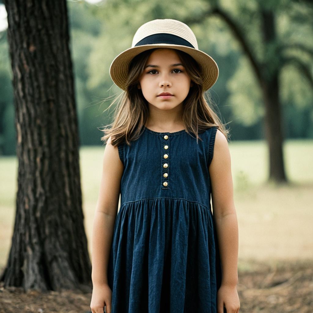 Child peanut costume,solo, 1girl, food, outdoors, realistic, tree, blonde hair, fruit, sandals, hairband, standing, blurry