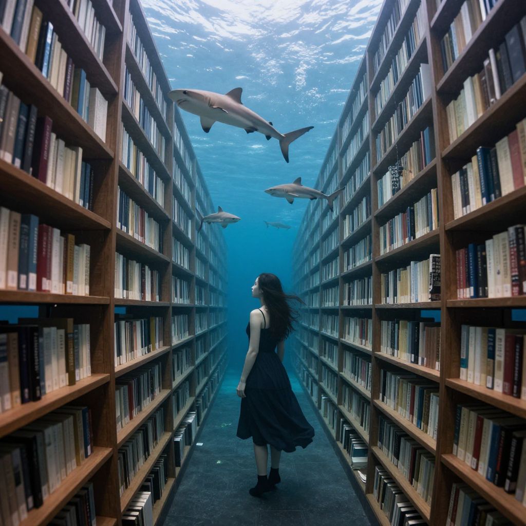 Underwater library shelves lined with countless books stretch endlessly, illuminated by ethereal light as a woman in a dark dress stands contemplatively, surrounded by schools of sharks gracefully swimming above her, creating a surreal blend of knowledge and aquatic mystery.