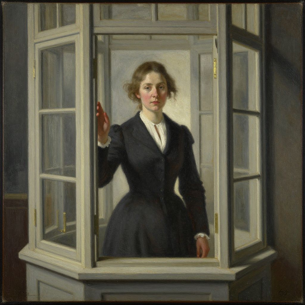 Oil painting of a Victorian-era woman with curly brown hair, wearing a black dress, standing in an open, white-framed window.