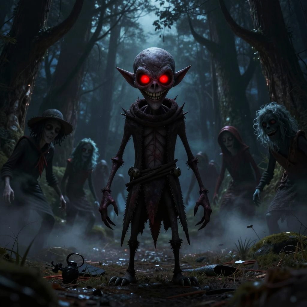 Evil Tom Nook standing in a dark forest at night, glowing red eyes, twisted smile, surrounded by shadowy villagers, eerie mist swirling around, sinister vibe, detailed textures, moody lighting, stylized horror atmosphere.
