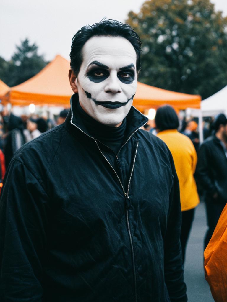 Candid photo of a man wearing high-quality Halloween makeup and costume at a Halloween festival. The man has pale white face paint with dark eye makeup, slicked-back hair, and is dressed in a black and white patterned jacket with black gloves. The background shows an outdoor festival setting with string lights and people in costumes.