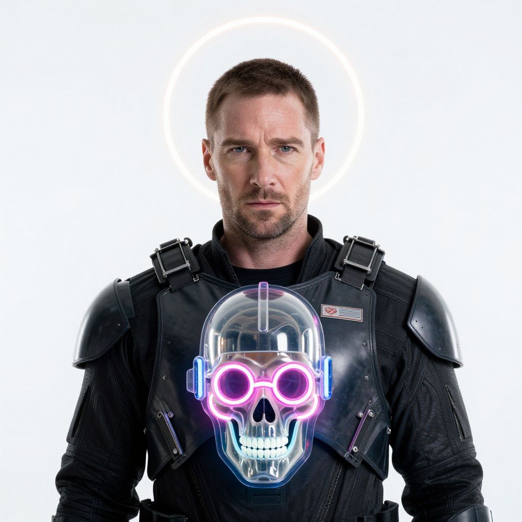"Jason Bourne a photography portrait, galatic emperor men, halo neon, armor plastic neon, skeleton head, transparent plastic , helmet neon futuristic, white background,"