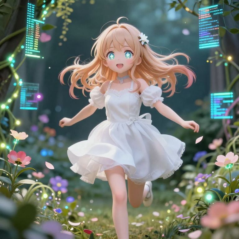 Score_9, score_8_up, score_7_up, source_anime, cowboy shot, looking at viewer, smile, open mouth, happy, 1girl, very long curly hair, platinum blonde hair, aqua eyes, bangs, short sundress, big neckline, running, outdoors, field, flower, tree, lake, mountain8k, glowing lines, spectrographic illumination, rainbow environmental refraction, breathtaking, hyper realistic, hyper detailed, maximum fidelity, ultra high detail, ultra HD, luminous refractions, subsurface scattering, dynamic hdr tone mapping, maximal attention to correctness