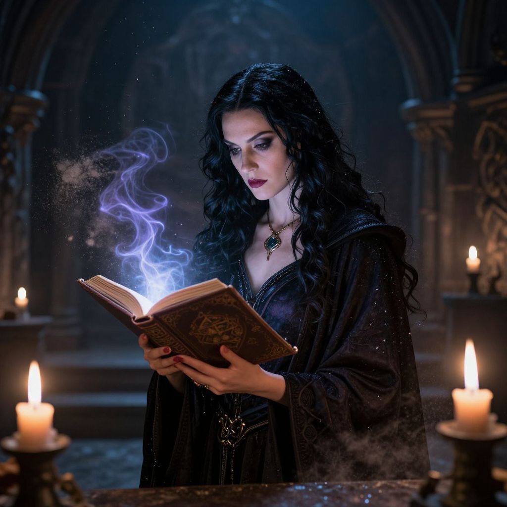 Photograph-like digital art of a dark-haired witch in a black robe, reading a glowing book with blue smoke, surrounded by candlelit, gothic