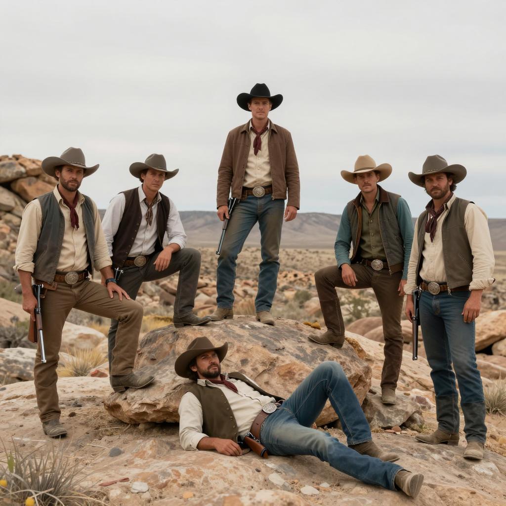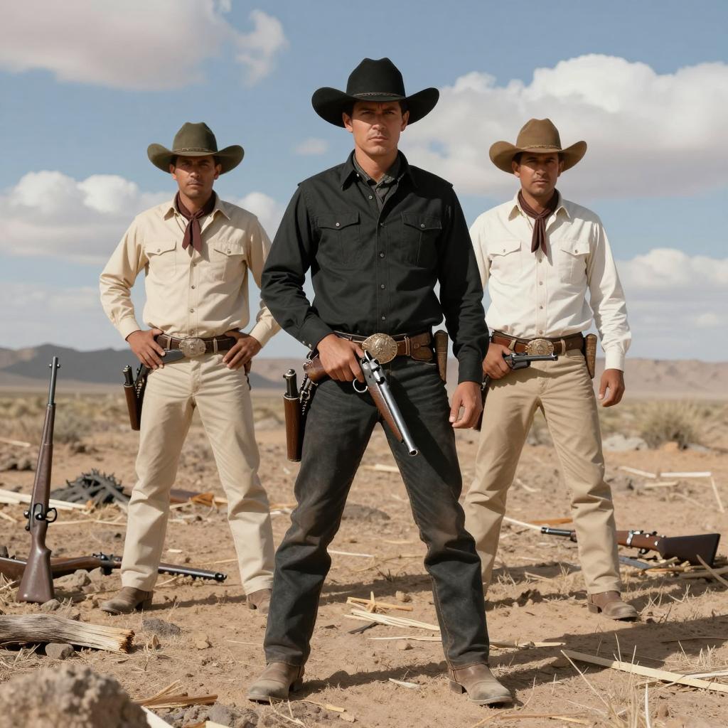Western-style photograph of six cowboys aiming guns at a white stucco church with a bell tower. Blue sky, desert background. Cowgirls and cowboys in brown and grey clothes, hats, and boots. One woman in the center, five men to the left and right. One man on a horse. Intense expressions. Cowgirl with black hair, others with dark hair. Cowboys with hats, some turned back. Sunlit, dusty ground.
