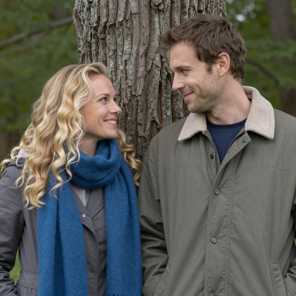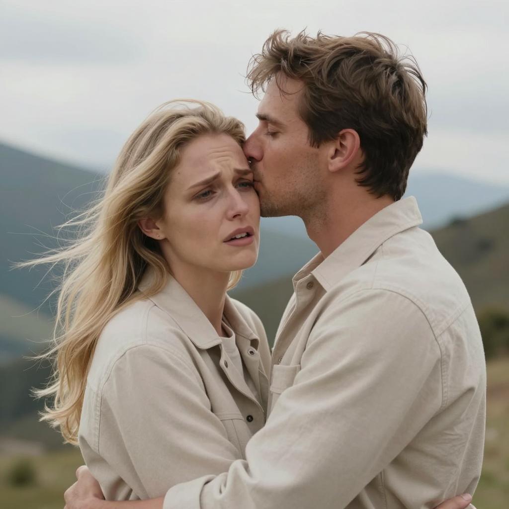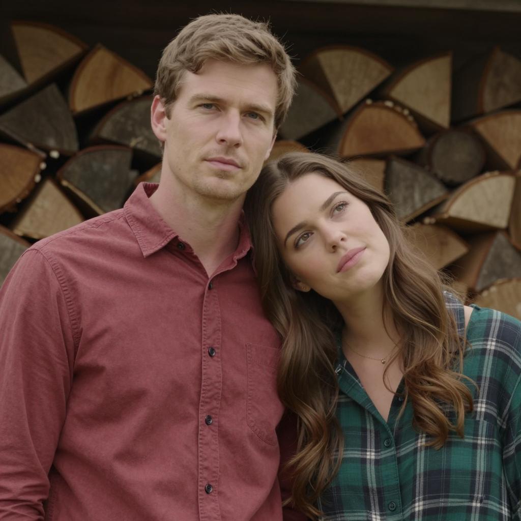 Photograph of a man and woman standing outdoors. The man, with short brown hair, wears a blue shirt and embraces the woman from behind. The woman, with blonde hair, smiles and wears a pink patterned top. Dense forest and mountains in the background. The man's right hand grips the woman's left shoulder. Both have relaxed expressions.