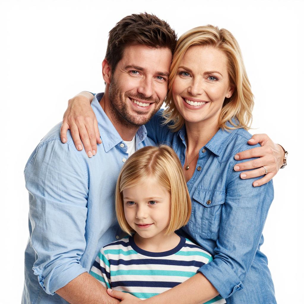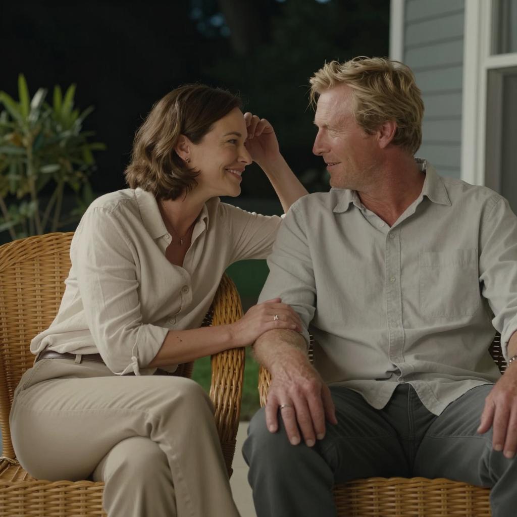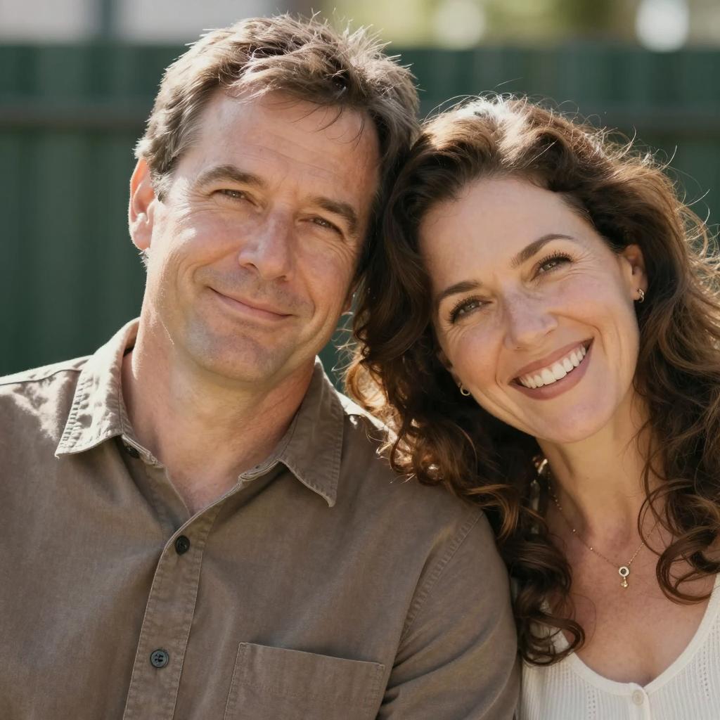 Photograph of a man and woman standing outdoors. The man, with short brown hair, wears a blue shirt and embraces the woman from behind. The woman, with blonde hair, smiles and wears a pink patterned top. Dense forest and mountains in the background. The man's right hand grips the woman's left shoulder. Both have relaxed expressions.