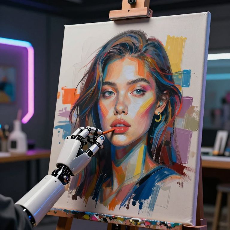 AI to create images, robotic hands crafting breathtaking portraits on a canvas, neon glow accents, high-tech studio environment, ultra-realistic textures combined with abstract visual elements, cinematic lighting.