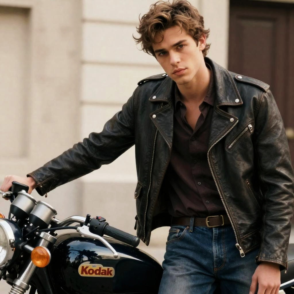 High quality photography of one handsome young man sitting in a chair, (((full body))), (wearing black boots:1.5), spread legs, (leather jacket and pants), tattoo, background of a motorcycle, (muscular, large pectorals, abs:1.3), (eyes open), high res, detailed realistic image, (beautiful eyes), (detailed face), perfect body, Studio(8k, RAW photo, best quality, masterpiece:1.2), High detail RAW color photo, professional photograph, ((best quality)), (finerly detailed face:1.2), (masterpiece:1.5), (best quality:1.2)