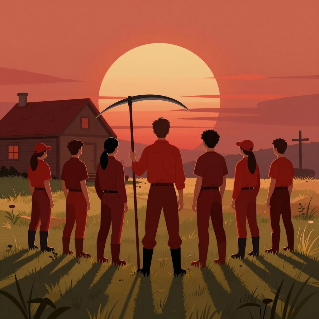 Illustration of seven people in red-toned clothing standing in a grassy field at sunset. Central figure holds a curved scythe. House with a rounded roof in the background. Red sky with large sun. People's backs and sides visible, wearing boots and pants. Crosses in the distance. Shadows and highlights emphasize forms.