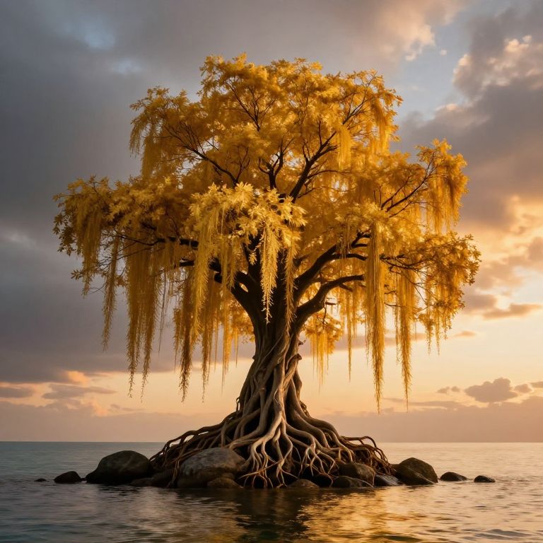 Towering golden tree stands alone on a small rocky island, its sprawling roots gripping the earth while cascading amber tendrils drape downward, reflecting warmly on the tranquil sea beneath a dramatic sunset sky.