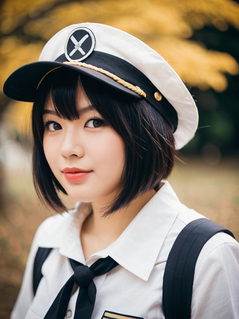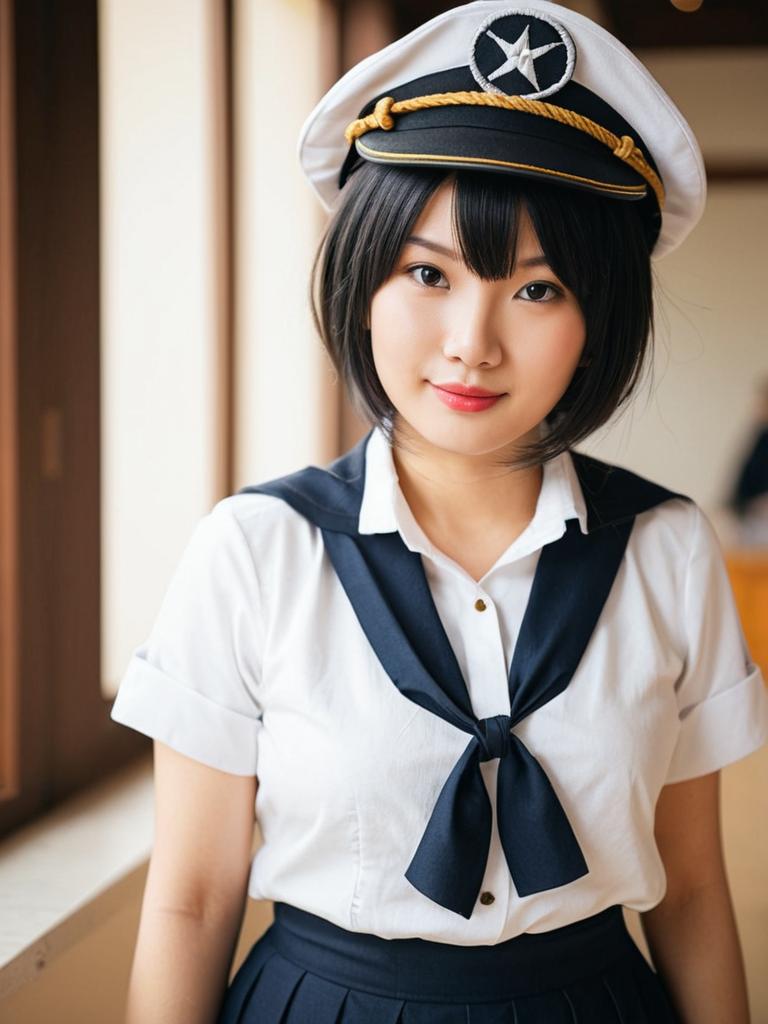 Photo-realistic cosplay photo of person in arare (kancolle) costume. 1girl, brown eyes, short hair, black hair, hat, white shirtlifestyle stock photo, shallow depth of field, lifestyle stock photography, shallow depth of field, natural lighting, warm tones, soft background blur, candid moments, vibrant colors, realistic textures, modern casual clothing. full body shot