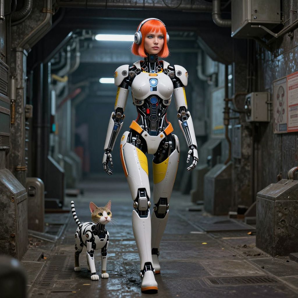 CGI image of a futuristic, orange-haired, white and black robotic woman with yellow accents, walking a small robotic cat in a dimly lit,