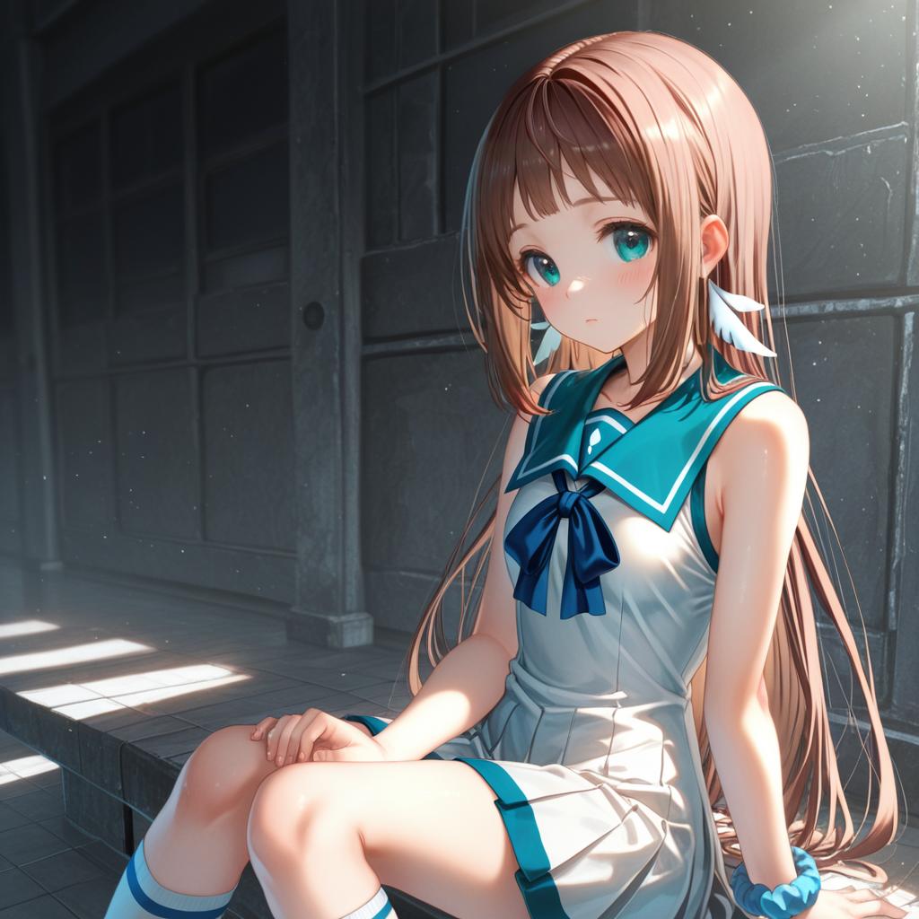 Digital artwork of an anime girl with long brown hair and blue eyes, wearing a Nami Junior High School sailor dress uniform with a blue collar and bow. She is sitting indoors in soft lighting, depicted in a detailed and delicate anime style.