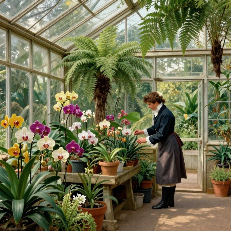 Victorian garden painting depicting a charming greenhouse interior filled with exotic plants, orchids, and ferns, dappled sunlight filtering through glass, with a gardener tending to blooms in period attire, realistic and vivid colors.