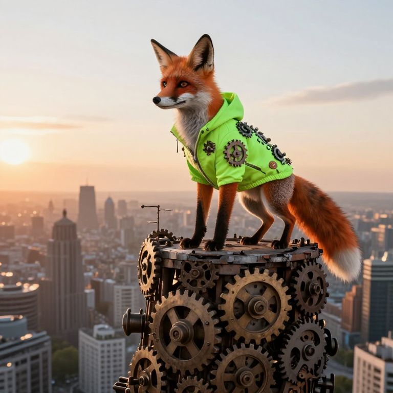 A cunning fox clad in a vivid, neon-green jacket studded with intricate gears stands atop an ancient tower as it surveys the sprawling metropolis beneath. The tower's decrepit structure is adorned with intertwining gears and cogs that seamlessly merge with the urban tapestry below, crafting a mesmerizing blend of industrial might and natural splendor. Basking in the warm embrace of the setting sun, the cityscape is bathed in a soft glow as the fox's penetrating gaze hints at an insatiable desire to unravel the enigmas hidden within this fantastical realm.