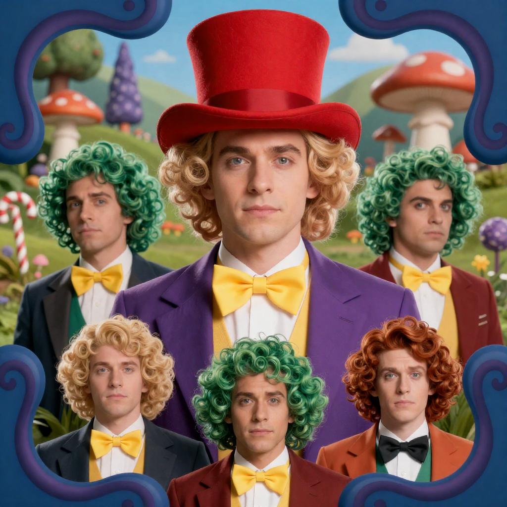 Photograph of a man in a red top hat, purple jacket, yellow bow tie, and white shirt, with curly blonde hair. Surrounding him are smaller images of the same man with green wigs, and other characters in similar outfits. Background features colorful, whimsical landscape with mushrooms and candy cane trees. Blue and purple swirls frame the image. The central figure has a neutral expression. Other characters have intense expressions.