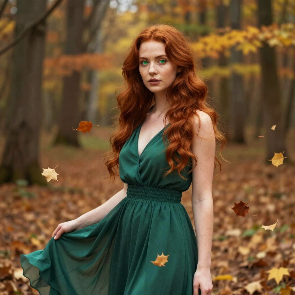 Curly red hair woman standing in a sunlit autumn forest, her vibrant hair glowing against golden leaves, wearing a flowing emerald green dress, soft natural light highlighting her freckles, with a serene and confident expression, detailed and realistic style.