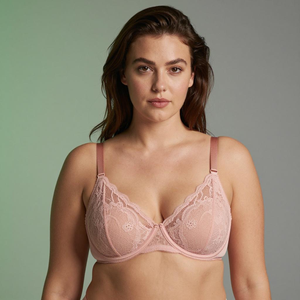 Photograph of a woman with fair skin and blonde hair. She wears a pale pink lace bra, highlighting large breasts. She looks slightly to the right with a neutral expression. Background is a plain light gray. Her left arm is partially visible. She has light makeup and natural eyebrows. The image focuses on her upper body.