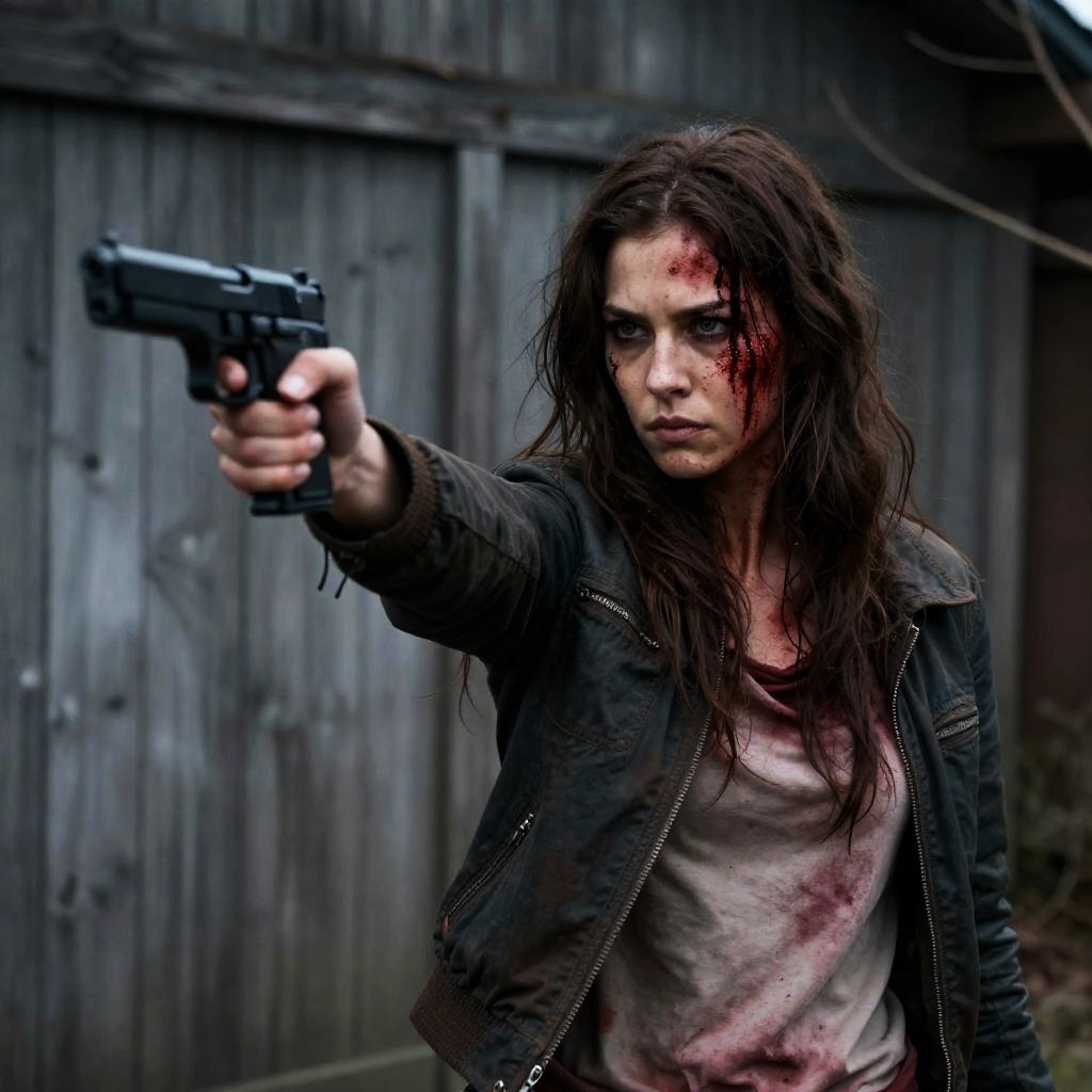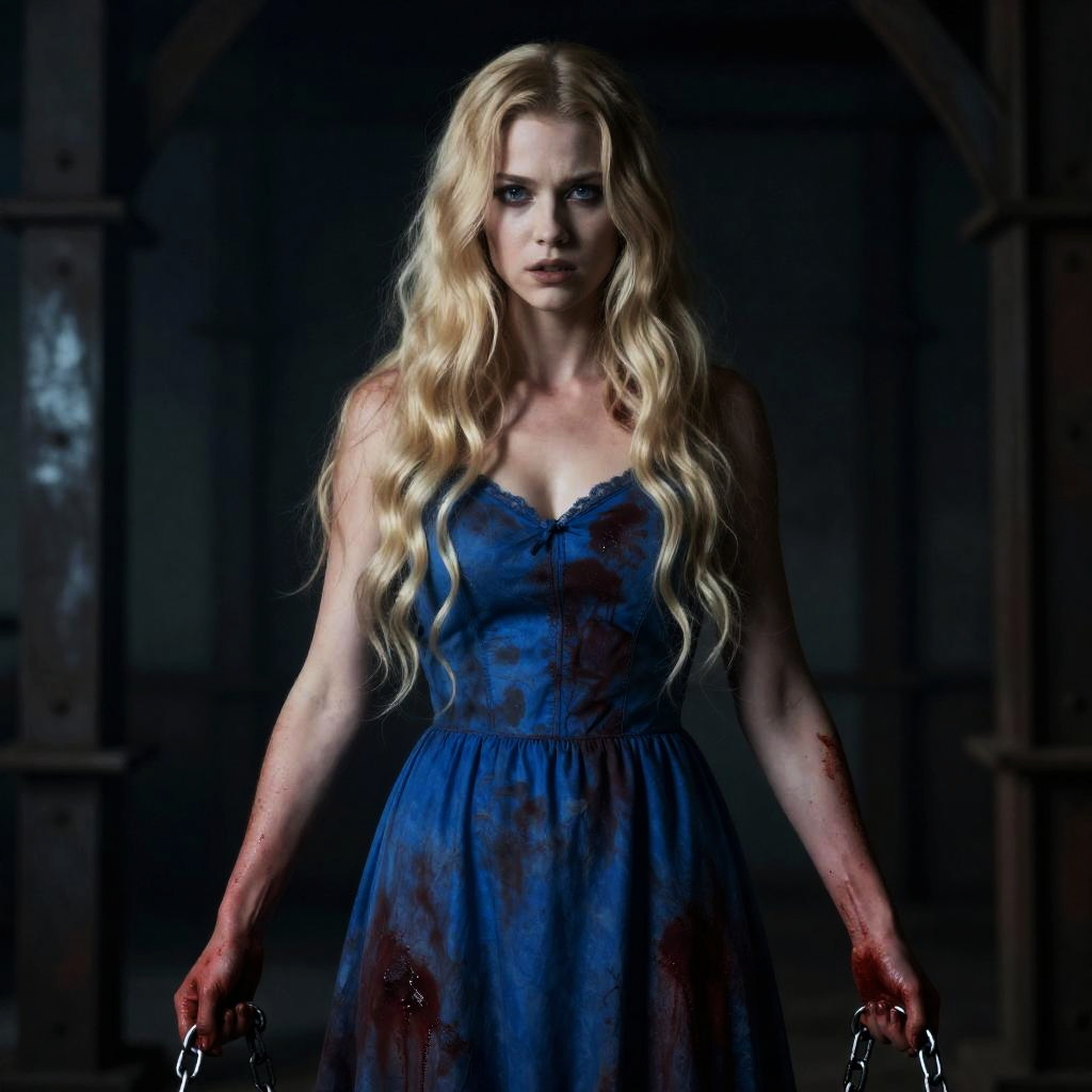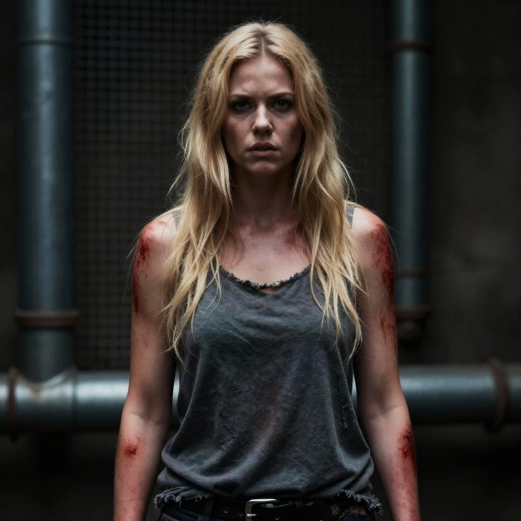 Photograph of a woman with long, wild blonde hair, bloodied arms, and a torn gray sleeveless top. Intense facial expression. Background includes dark, industrial setting with metal pipes and mesh. Dim lighting. Woman stands center, looking forward.