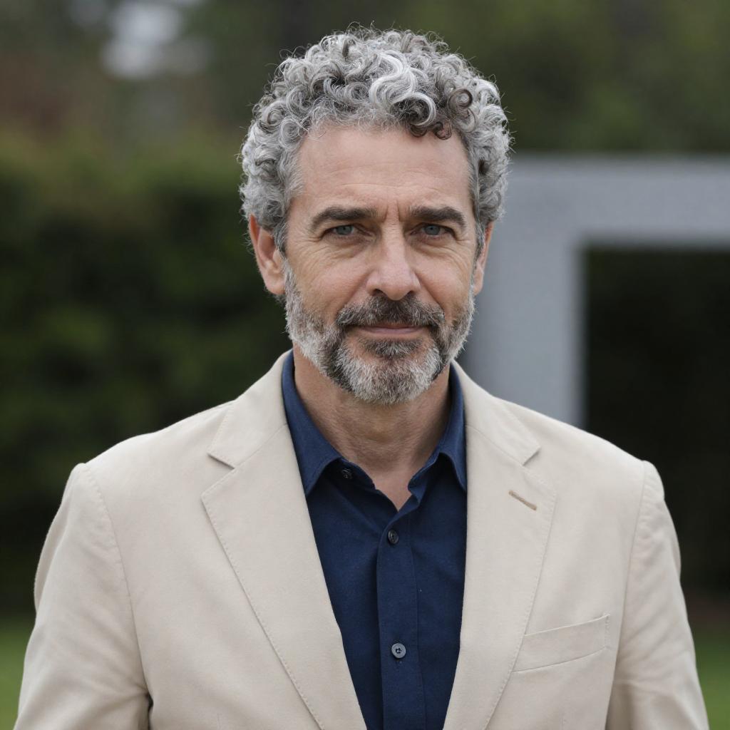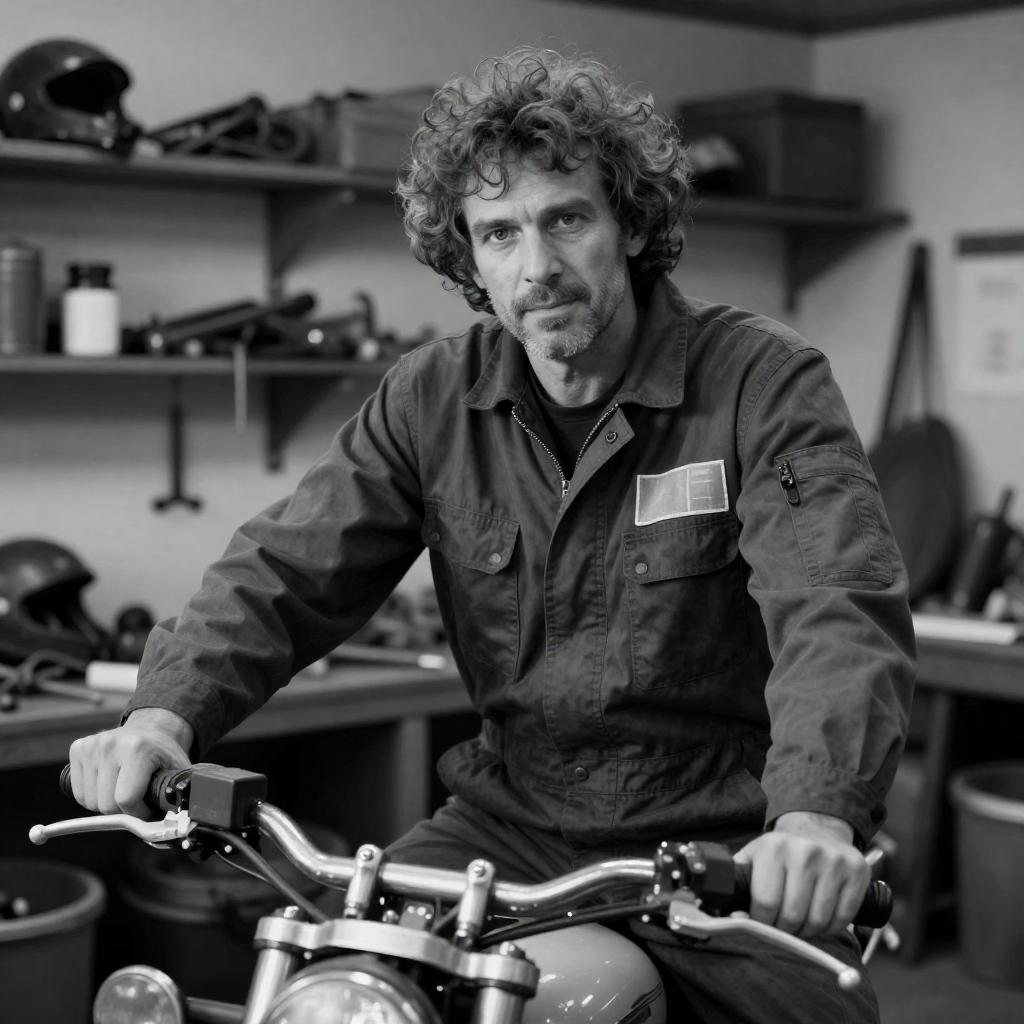 Black and white photograph of a middle-aged man with curly, unkempt hair, wearing a dark jumpsuit with a patch on the chest, sitting on a motorcycle in a cluttered workshop. He holds the handlebars, looking slightly to the side with a neutral expression. Background includes shelves with various tools and equipment. Man has a slight beard and rugged appearance. Intense lighting highlights his face.