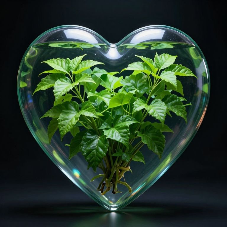 The image depicts a highly detailed, futuristic scene featuring a heart-shaped plant with vibrant green leaves floating inside a transparent glass aquarium. The aquarium is heart-shaped, with a glossy, reflective surface that captures the light, creating a mesmerizing effect. The plant within the aquarium is lush and intricate, with numerous branches and leaves that appear to be in a state of growth and vitality. The background is dark, which contrasts sharply with the bright green of the plant and the clear, transparent glass, making the aquarium and its contents the focal point of the image. The overall composition is balanced, with the heart-shaped plant centrally positioned within the aquarium, creating a sense of harmony and tranquility. The scene evokes a sense of fantasy and wonder, with the heart-shaped plant and the transparent glass aquarium suggesting a futuristic, otherworldly setting.