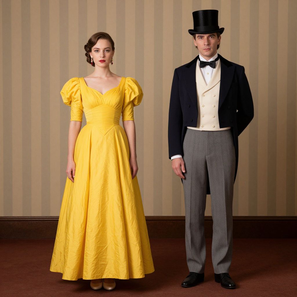 Elegant figures stand side by side in a vintage theater setting, with a woman in a vibrant yellow gown featuring puffed sleeves and a man in a formal navy coat, cream vest, gray trousers, and a matching top hat, both exuding sophistication against a striped backdrop.