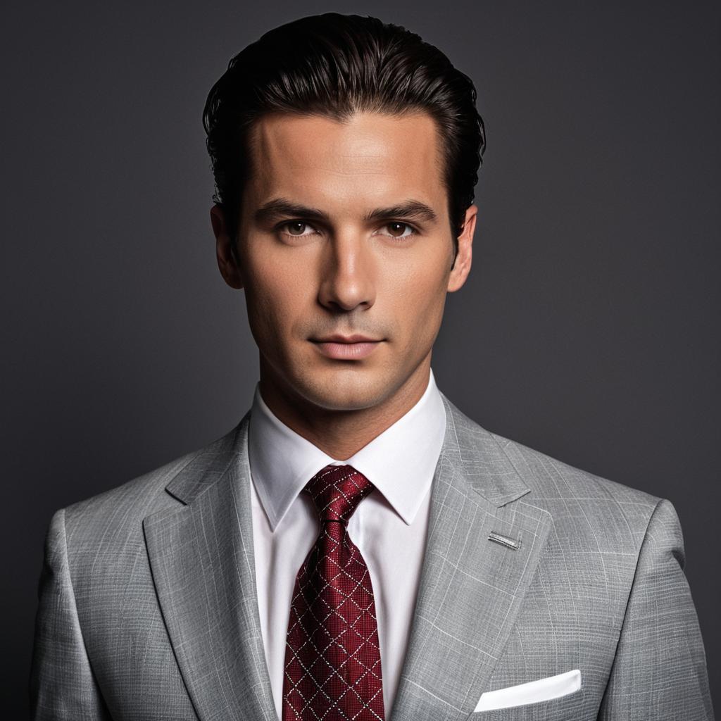 Medium close-up portrait of an adult male with dark brown slicked-back hair and a serious expression, wearing a light gray suit with subtle check pattern, white dress shirt, red patterned tie, and white pocket square against a gray studio background. The image is sharp, well-lit, and showcases elegant business attire.