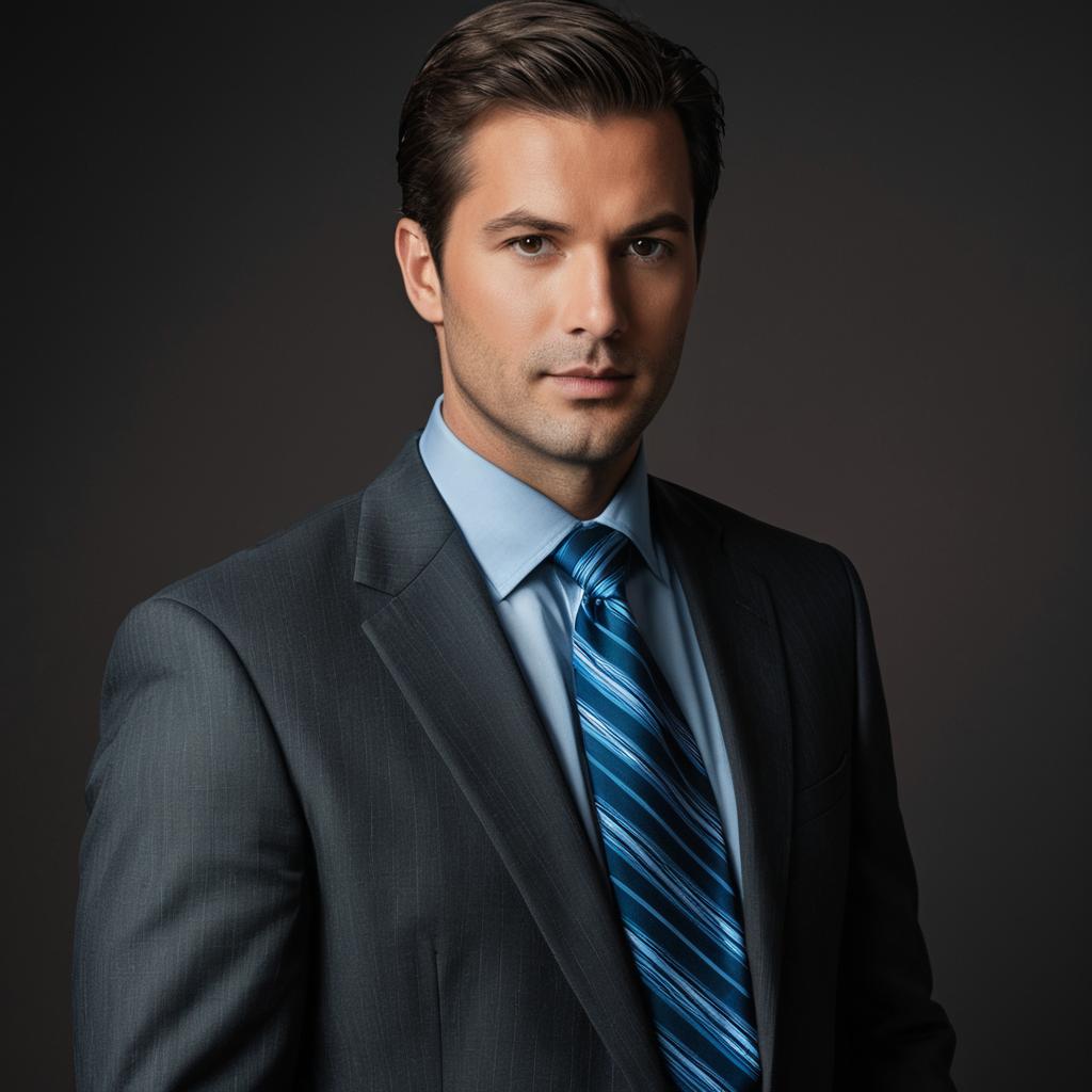 Patrick bateman outfit, photograph of a handsome man, medium close-up, standing, wearing a light gray suit, white shirt, red patterned tie, pocket square, dark brown slicked-back hair, serious expression, gray background, professional, portrait, studio lighting, realistic, sharp details, elegant, business attire, adult male, well-groomed