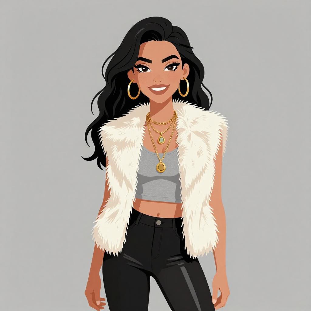 Woman with pretty face and pretty hair. smiling Woman, glam rock, white faux fur open-front vest, heather grey tank top, black shiny leggings, layered necklaces with pendant. --sref 1467