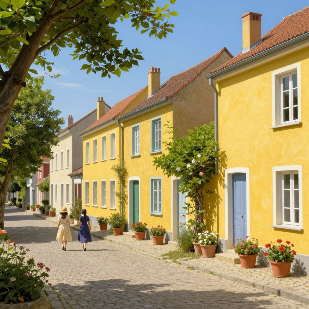This vibrant photograph depicts a charming, sunlit cobblestone street in a quaint European village. Bright yellow and beige two-story houses with red-tiled roofs line the street, each adorned with white-framed windows and potted plants. A large, leafy tree shades the left side, casting dappled shadows on the pavement. Two elegantly dressed women, one in a white dress and the other in a blue dress, walk along the street, heading away from the camera. The sky is clear and blue, enhancing the cheerful, picturesque atmosphere.