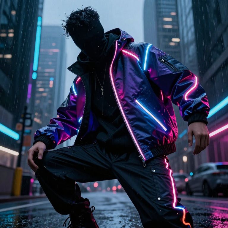 Trchwear futuristic urban fashion, sleek neon-lit jackets with glowing seams, cyberpunk cityscape background, dark rainy atmosphere, detailed textures on fabric, modern streetwear style, vibrant colors and dynamic pose, digital art.