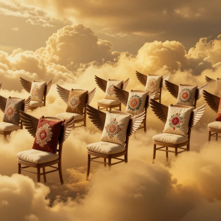 Photograph-like digital artwork depicting a surreal scene of wooden chairs with white cushions and intricate red and green embroidered designs, floating amidst golden-hued clouds. Each chair has black wings attached to the backrest, creating an ethereal, heavenly atmosphere. The warm sunlight filters through the clouds, casting a glowing, golden light over the entire scene. The chairs are arranged in a slightly diagonal, staggered pattern, giving a sense of depth and movement, as if they are gently rising or descending through the sky.