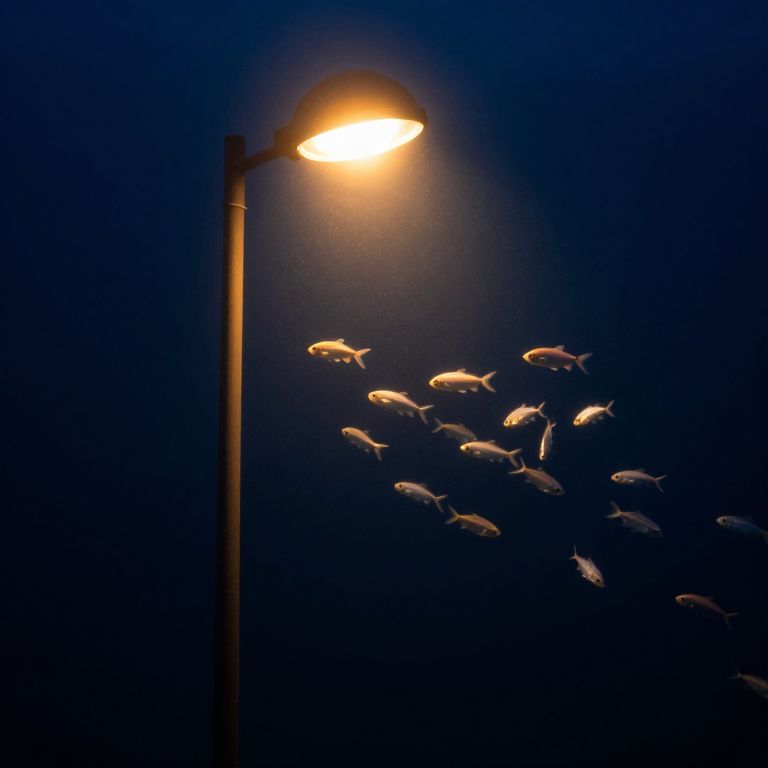 A solitary streetlamp emerges from the depths of a dark, aquatic expanse, casting a warm glow that draws a school of translucent fish toward its light, revealing their forms as they converge.