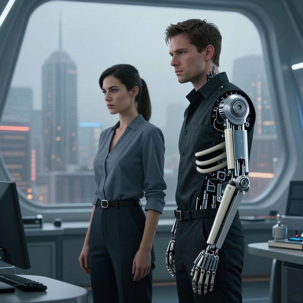 Photograph-like CGI of a cybernetic man in black shirt with exposed robotic arm, standing beside a woman in gray blouse, in futuristic office with