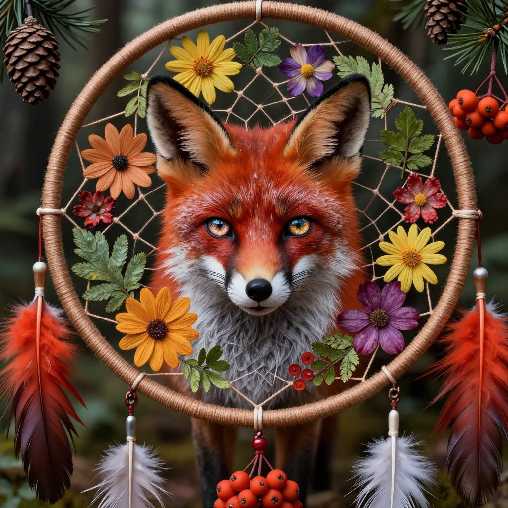 Very realistic photography, close-up of a dream catcher with a beautiful red fox in the center with shimmering piercing eyes, Digital masterpiece of the Leaf and Nature application, pressed flowers, feathers, complex forest background of cinematic hyperrealism, rowan berries, fantasy of pine cones, chiaroscuro, fantasy, triadic colors, storybook illustration, beautiful unusual details very detailed, masterpiece of small details, high quality, complex lighting, luminism, Miki Asai Macro photography, close-up, hyper detailed, trending on artstation, sharp focus, studio photo, intricate details, highly detailed, by greg rutkowski
