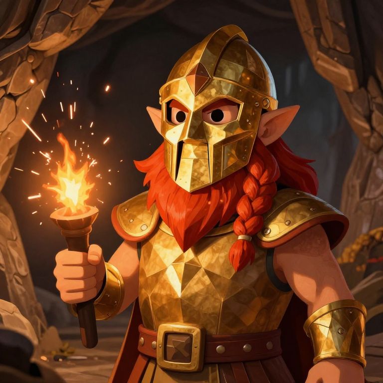 A digital illustration of a fantasy warrior with pointed ears, wearing a golden, metallic helmet with a visor, and a red braided beard. The character holds a lit torch in their right hand, casting a warm glow on their golden armor adorned with a diamond pattern. They have a determined expression with large, dark eyes visible through the helmet's visor. The background features a dark, cavernous setting with rocky walls and dim lighting, creating a mysterious atmosphere. The warrior's left arm is visible, showing a brown leather bracer. The image has a vibrant, cartoonish style with rich, warm colors.