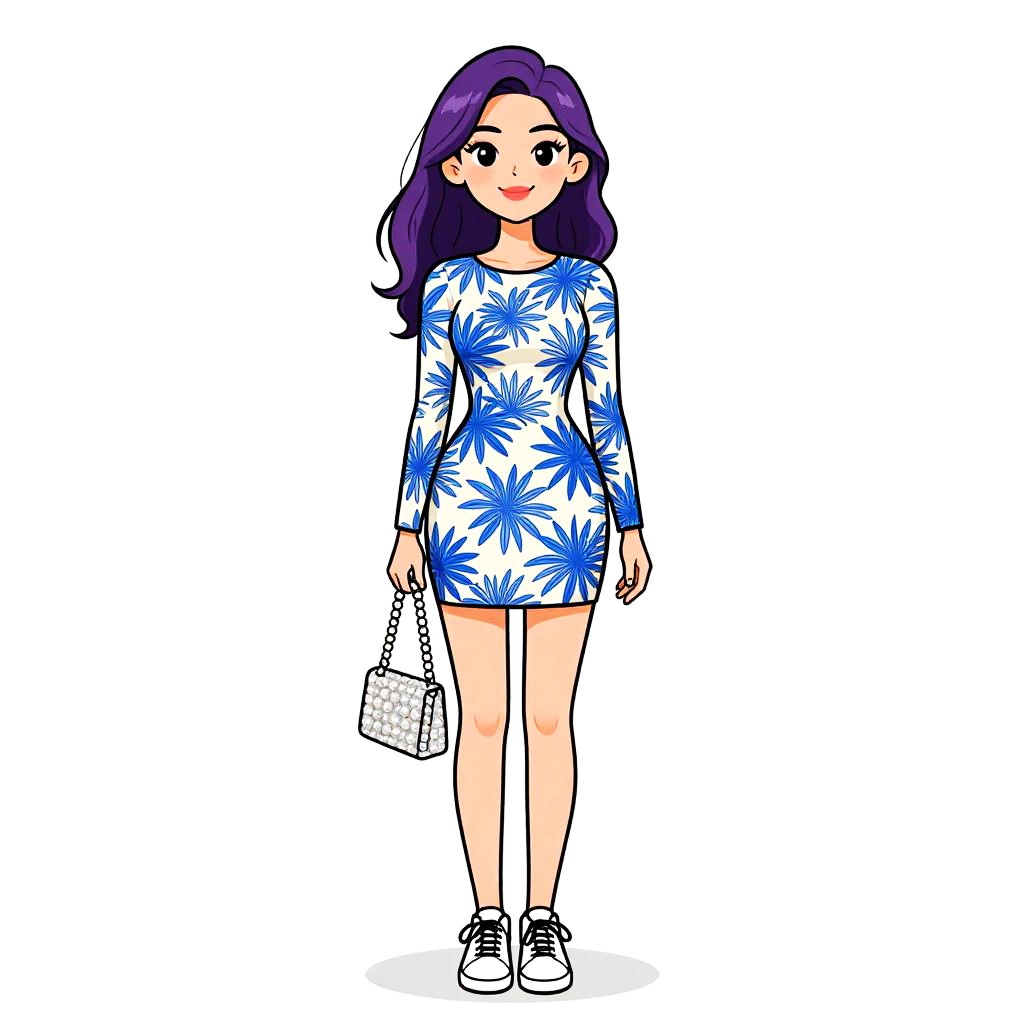 Digital illustration of a young Asian woman with fair skin and shoulder-length, wavy purple hair. She wears a white long-sleeve mini dress with a bold blue floral pattern, black sneakers, and carries a small white quilted handbag with a chain strap in her right hand. Her expression is cheerful with a slight smile, and she stands against a plain white background. The art style is cartoonish with clean lines and vibrant colors.