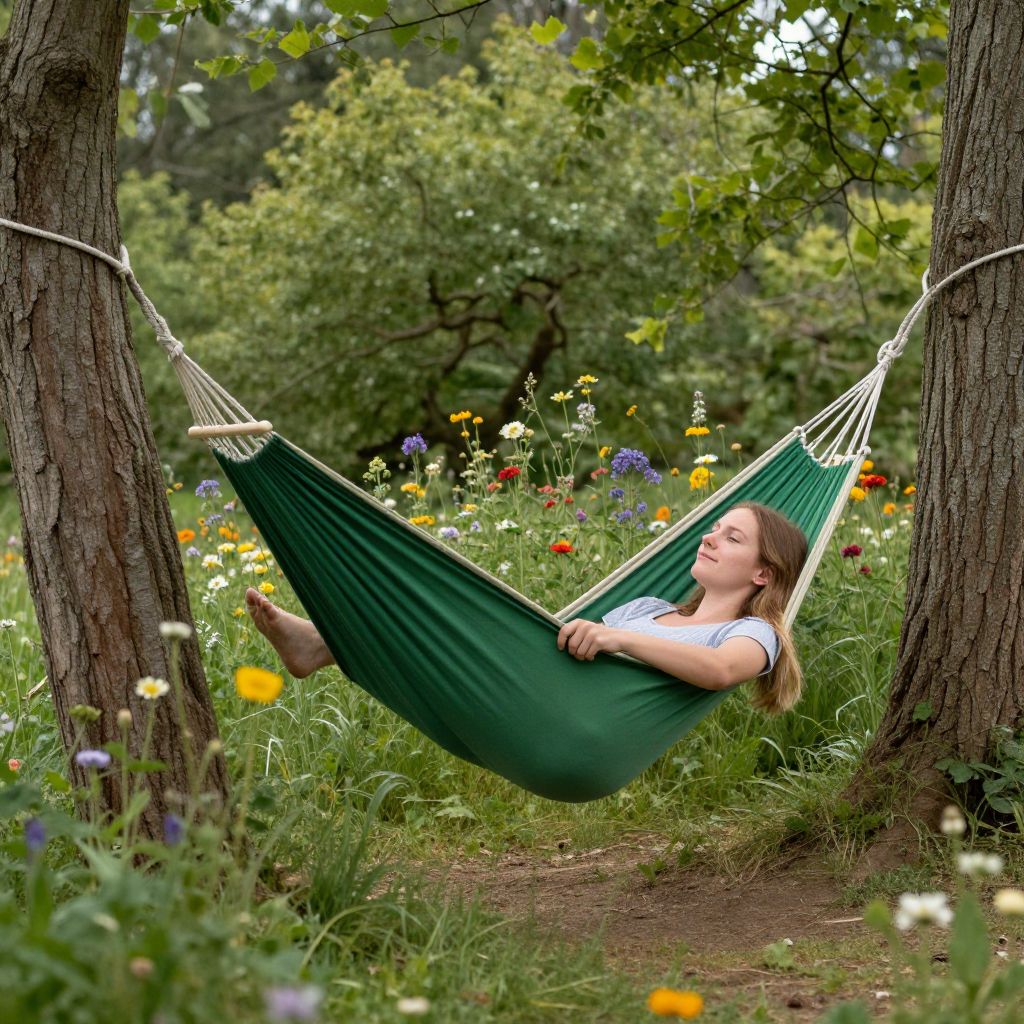 Woman relaxing in a green hammock suspended between two trees, surrounded by lush foliage and vibrant wildflowers, enjoying leisure time outdoors.